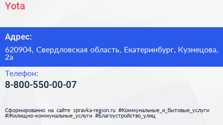 Yota по адресу 620904, Свердловская область, Екатеринбург, Кузнецова, 2а в дальнейшем Организация, размещена в следующих категориях:
