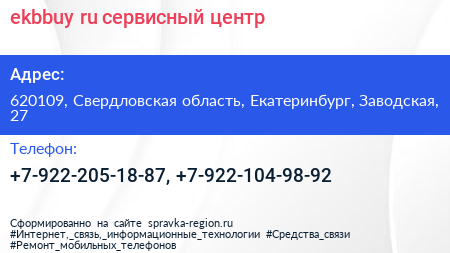 ekbbuy.ru, сервисный центр по адресу 620109, Свердловская область, Екатеринбург, Заводская, 27 в дальнейшем Организация, размещена в следующих категориях: