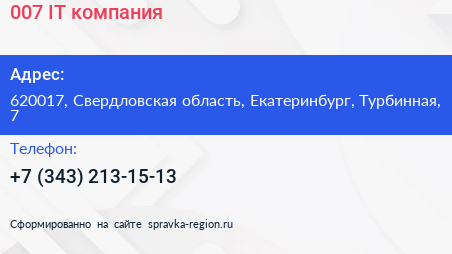 007, IT-компания по адресу 620017, Свердловская область, Екатеринбург, Турбинная, 7 в дальнейшем Организация, размещена в следующих категориях: