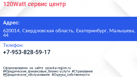 120Watt, сервис-центр по адресу 620014, Свердловская область, Екатеринбург, Малышева, 44 в дальнейшем Организация, размещена в следующих категориях:
