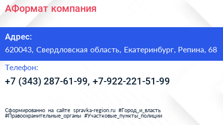 Для связи с организацией воспользуйтесь номером телефона: +7 (343) 287-61-99, +7-922-221-51-99. Пн: c 09:00-18:00, Вт: c 09:00-18:00, Ср: c 09:00-18:00, Чт: c 09:00-18:00, Пт: c 09:00-17:00, Сб: выходной, Вс: выходной, вы можете обратиться в эту организацию.