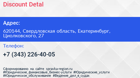 Discount-Detal по адресу 620144, Свердловская область, Екатеринбург, Циолковского, 27 в дальнейшем Организация, размещена в следующих категориях: