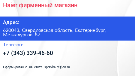 Haier, фирменный магазин по адресу 620043, Свердловская область, Екатеринбург, Металлургов, 87 в дальнейшем Организация, размещена в следующих категориях: