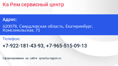 Ка-Рем, сервисный центр по адресу 620078, Свердловская область, Екатеринбург, Комсомольская, 71 в дальнейшем Организация, размещена в следующих категориях: