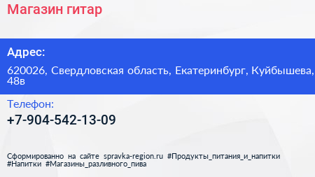 Магазин гитар по адресу 620026, Свердловская область, Екатеринбург, Куйбышева, 48в в дальнейшем Организация, размещена в следующих категориях: