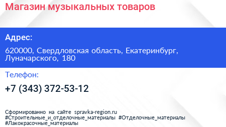 Магазин музыкальных товаров по адресу 620000, Свердловская область, Екатеринбург, Луначарского, 180 в дальнейшем Организация, размещена в следующих категориях:
