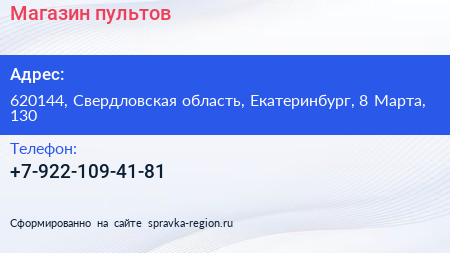 Магазин пультов по адресу 620144, Свердловская область, Екатеринбург, 8 Марта, 130 в дальнейшем Организация, размещена в следующих категориях: