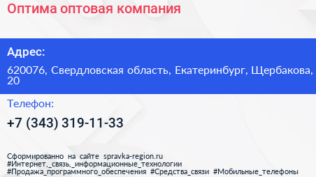 Оптима, оптовая компания по адресу 620076, Свердловская область, Екатеринбург, Щербакова, 20 в дальнейшем Организация, размещена в следующих категориях: