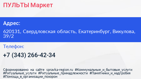 ПУЛЬТЫ-Маркет по адресу 620131, Свердловская область, Екатеринбург, Викулова, 39/2 в дальнейшем Организация, размещена в следующих категориях: