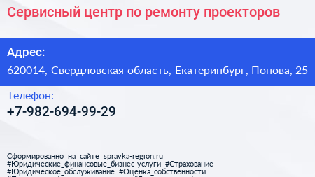 Сервисный центр по ремонту проекторов по адресу 620014, Свердловская область, Екатеринбург, Попова, 25 в дальнейшем Организация, размещена в следующих категориях: