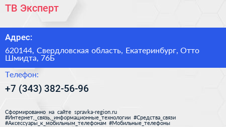 ТВ-Эксперт по адресу 620144, Свердловская область, Екатеринбург, Отто Шмидта, 76Б в дальнейшем Организация, размещена в следующих категориях: