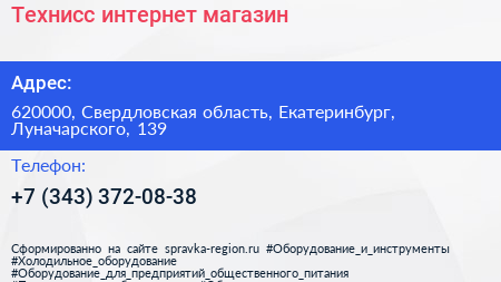 Технисс, интернет-магазин по адресу 620000, Свердловская область, Екатеринбург, Луначарского, 139 в дальнейшем Организация, размещена в следующих категориях: