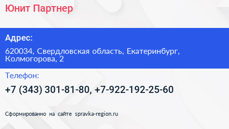 Юнит-Партнер по адресу 620034, Свердловская область, Екатеринбург, Колмогорова, 2 в дальнейшем Организация, размещена в следующих категориях: