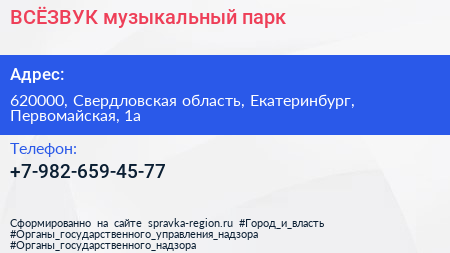 ВСЁЗВУК, музыкальный парк по адресу 620000, Свердловская область, Екатеринбург, Первомайская, 1а в дальнейшем Организация, размещена в следующих категориях: