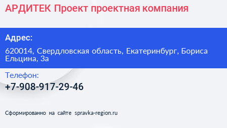 АРДИТЕК-Проект, проектная компания по адресу 620014, Свердловская область, Екатеринбург, Бориса Ельцина, 3а в дальнейшем Организация, размещена в следующих категориях: