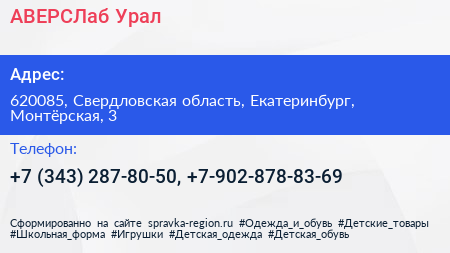 АВЕРСЛаб - Урал по адресу 620085, Свердловская область, Екатеринбург, Монтёрская, 3 в дальнейшем Организация, размещена в следующих категориях: