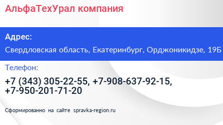 Для связи с организацией воспользуйтесь номером телефона: +7 (343) 305-22-55, +7-908-637-92-15, +7-950-201-71-20. Пн: c 08:00-17:00, Вт: c 08:00-17:00, Ср: c 08:00-17:00, Чт: c 08:00-17:00, Пт: c 08:00-17:00, Сб: выходной, Вс: выходной, вы можете обратиться в эту организацию.