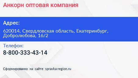 Анкорн, оптовая компания по адресу 620014, Свердловская область, Екатеринбург, Добролюбова, 16/2 в дальнейшем Организация, размещена в следующих категориях: