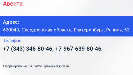 Авента по адресу 620043, Свердловская область, Екатеринбург, Репина, 52 в дальнейшем Организация, размещена в следующих категориях: