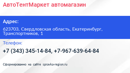 АвтоТентМаркет, автомагазин по адресу 623703, Свердловская область, Екатеринбург, Транспортников, 1 в дальнейшем Организация, размещена в следующих категориях: