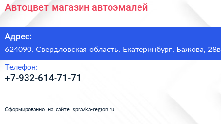 Автоцвет, магазин автоэмалей по адресу 624090, Свердловская область, Екатеринбург, Бажова, 28в в дальнейшем Организация, размещена в следующих категориях: