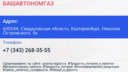 БАШАВТОНОМГАЗ по адресу 620144, Свердловская область, Екатеринбург, Николая Островского, 4а в дальнейшем Организация, размещена в следующих категориях: