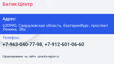 Батик-Центр по адресу 620990, Свердловская область, Екатеринбург, проспект Ленина, 38а в дальнейшем Организация, размещена в следующих категориях:
