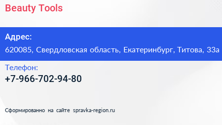 Beauty Tools по адресу 620085, Свердловская область, Екатеринбург, Титова, 33а в дальнейшем Организация, размещена в следующих категориях: