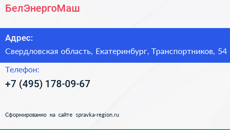 БелЭнергоМаш по адресу Свердловская область, Екатеринбург, Транспортников, 54 в дальнейшем Организация, размещена в следующих категориях: