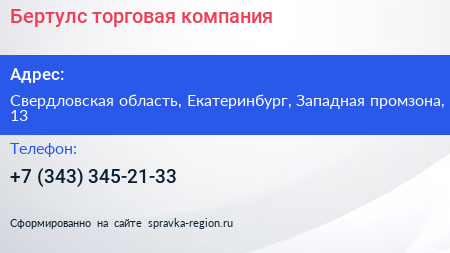 Бертулс, торговая компания по адресу Свердловская область, Екатеринбург, Западная промзона, 13 в дальнейшем Организация, размещена в следующих категориях: