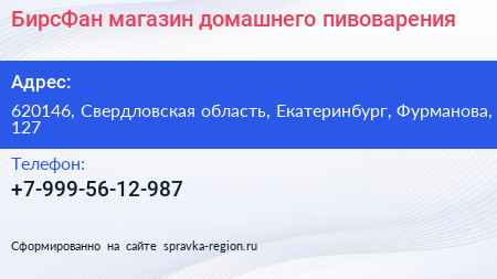 БирсФан, магазин домашнего пивоварения по адресу 620146, Свердловская область, Екатеринбург, Фурманова, 127 в дальнейшем Организация, размещена в следующих категориях: