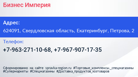 Бизнес Империя по адресу 624091, Свердловская область, Екатеринбург, Петрова, 2 в дальнейшем Организация, размещена в следующих категориях: