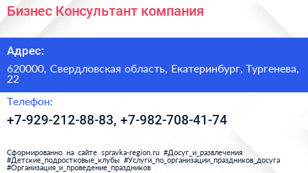 Бизнес-Консультант, компания по адресу 620000, Свердловская область, Екатеринбург, Тургенева, 22 в дальнейшем Организация, размещена в следующих категориях: