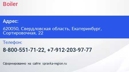 Boiler по адресу 620050, Свердловская область, Екатеринбург, Сортировочная, 22 в дальнейшем Организация, размещена в следующих категориях: