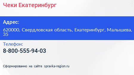 Чеки Екатеринбург по адресу 620000, Свердловская область, Екатеринбург, Малышева, 35 в дальнейшем Организация, размещена в следующих категориях: