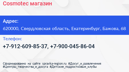 Cosmotec, магазин по адресу 620000, Свердловская область, Екатеринбург, Бажова, 68 в дальнейшем Организация, размещена в следующих категориях: