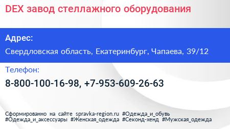 DEX, завод стеллажного оборудования по адресу Свердловская область, Екатеринбург, Чапаева, 39/12 в дальнейшем Организация, размещена в следующих категориях:
