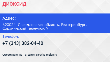 ДИОКСИД по адресу 620024, Свердловская область, Екатеринбург, Саранинский переулок, 9 в дальнейшем Организация, размещена в следующих категориях: