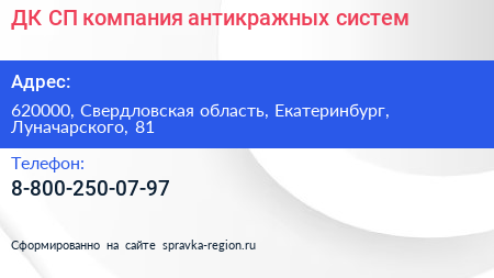ДК-СП, компания антикражных систем по адресу 620000, Свердловская область, Екатеринбург, Луначарского, 81 в дальнейшем Организация, размещена в следующих категориях: