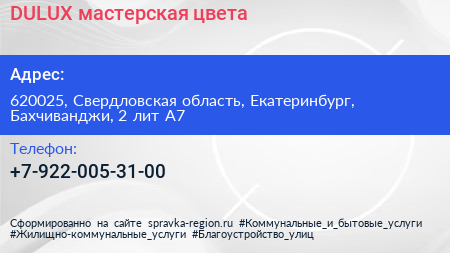 DULUX, мастерская цвета по адресу 620025, Свердловская область, Екатеринбург, Бахчиванджи, 2 лит А7 в дальнейшем Организация, размещена в следующих категориях: