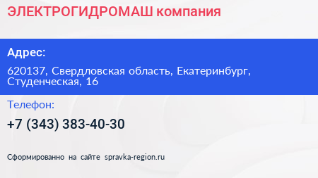 ЭЛЕКТРОГИДРОМАШ, компания по адресу 620137, Свердловская область, Екатеринбург, Студенческая, 16 в дальнейшем Организация, размещена в следующих категориях: