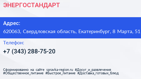 ЭНЕРГОСТАНДАРТ по адресу 620063, Свердловская область, Екатеринбург, 8 Марта, 51 в дальнейшем Организация, размещена в следующих категориях: