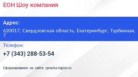 ЕОН Шоу, компания по адресу 620017, Свердловская область, Екатеринбург, Турбинная, 7 в дальнейшем Организация, размещена в следующих категориях: