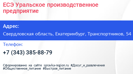 ЕСЭ, Уральское производственное предприятие по адресу Свердловская область, Екатеринбург, Транспортников, 54 в дальнейшем Организация, размещена в следующих категориях: