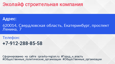 Эколайф, строительная компания по адресу 620014, Свердловская область, Екатеринбург, проспект Ленина, 7 в дальнейшем Организация, размещена в следующих категориях: