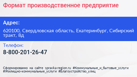 Формат, производственное предприятие по адресу 620100, Свердловская область, Екатеринбург, Сибирский тракт, 8д в дальнейшем Организация, размещена в следующих категориях: