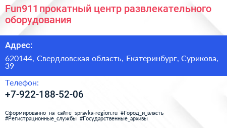 Fun911, прокатный центр развлекательного оборудования по адресу 620144, Свердловская область, Екатеринбург, Сурикова, 39 в дальнейшем Организация, размещена в следующих категориях: