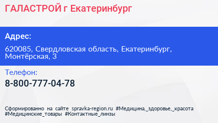 ГАЛАСТРОЙ, г. Екатеринбург по адресу 620085, Свердловская область, Екатеринбург, Монтёрская, 3 в дальнейшем Организация, размещена в следующих категориях: