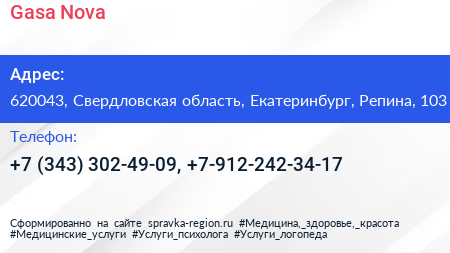 Gasa Nova по адресу 620043, Свердловская область, Екатеринбург, Репина, 103 в дальнейшем Организация, размещена в следующих категориях: