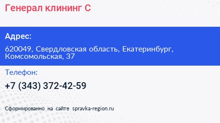 Генерал-клининг С по адресу 620049, Свердловская область, Екатеринбург, Комсомольская, 37 в дальнейшем Организация, размещена в следующих категориях: